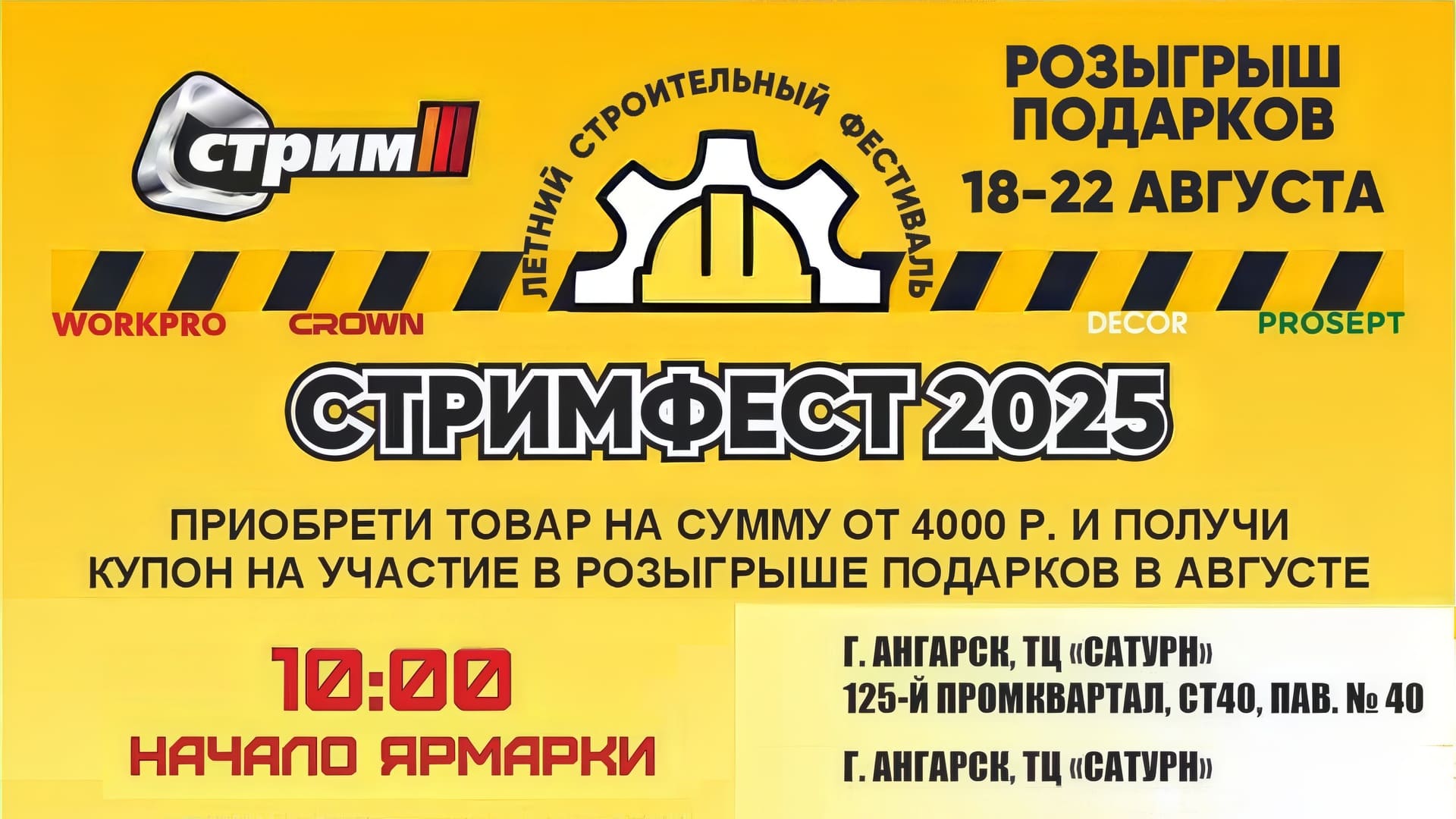 18 августа 2025 года на базе «Сатурн» в Ангарске состоялась масштабная строительная ярмарка «Стримфест 2025». Это уникальное мероприятие, организованное компанией СТРИМ. Центр крепежа и стройматериалов собрал профессионалов и любителей ремонта, строительства и благоустройства.